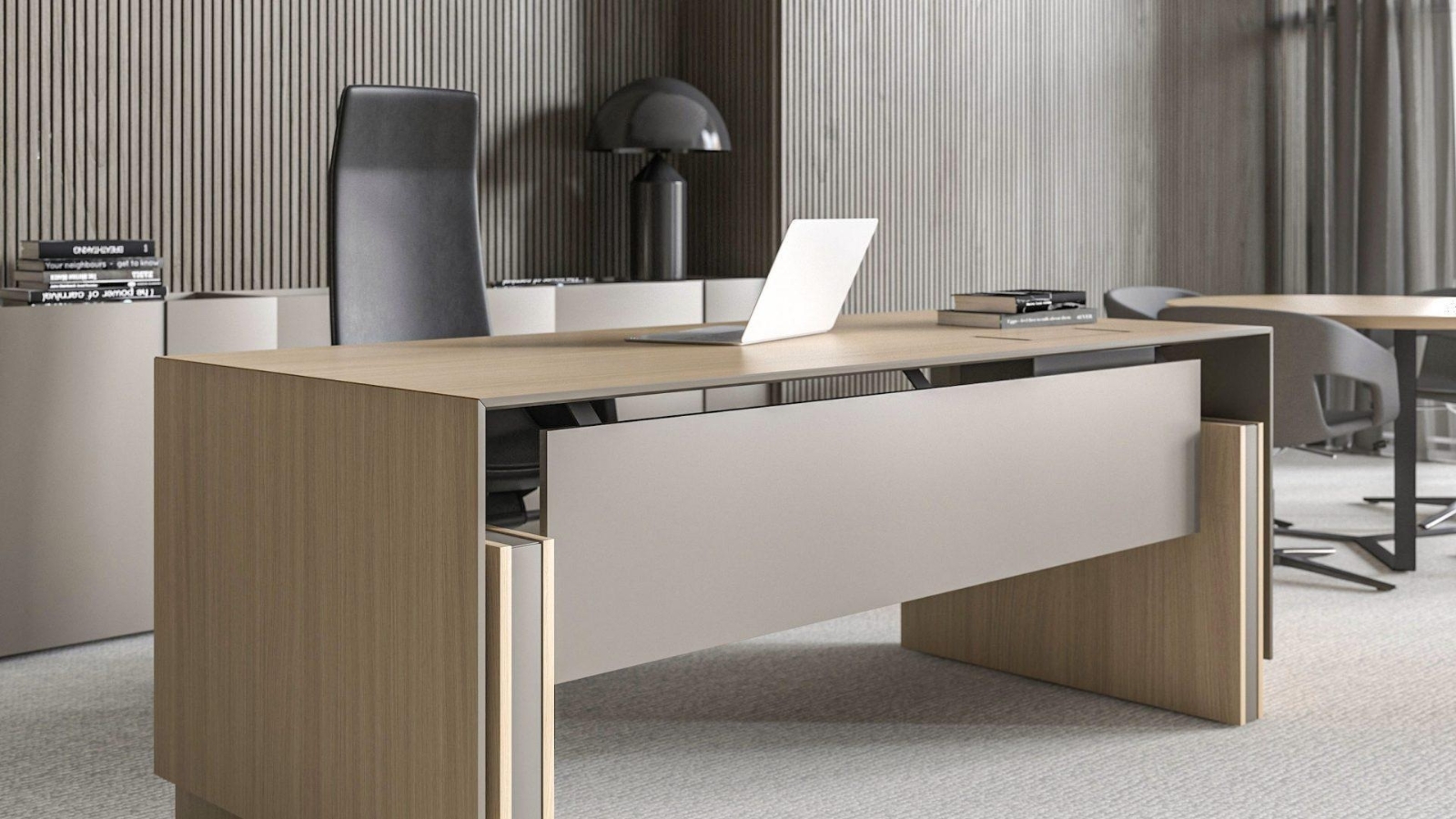 Material: MDF or MFC desktop with veneer or melamine finish, panel legs in veneer or MFC, powder-coated metal frame and lifting columns