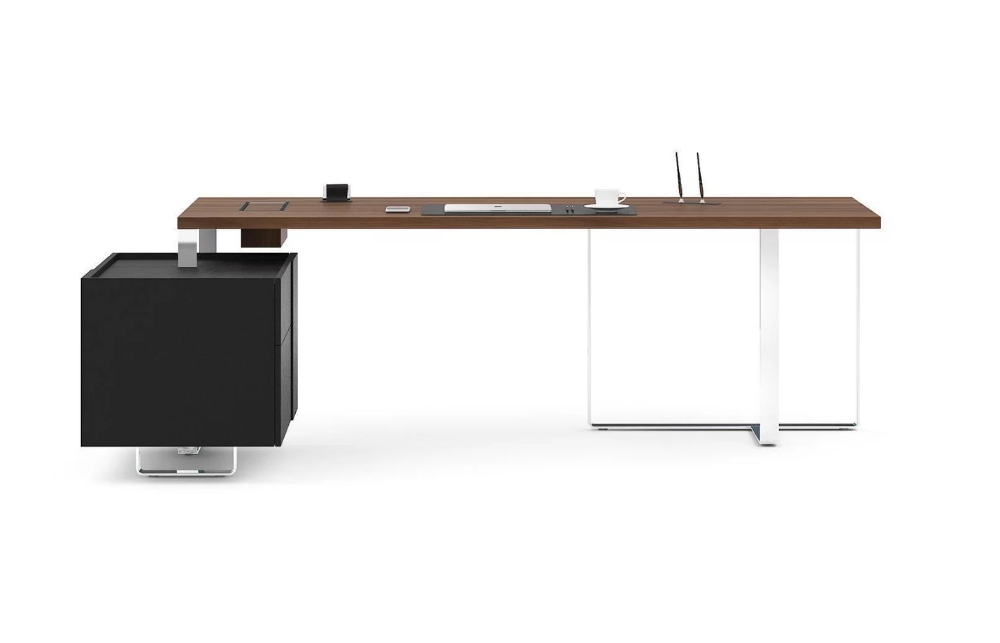 Note: Executive desk system available in right- or left-hand configurations with options for modesty panels and fixed pedestals. Includes integrated grommet with metal frame and cable box for power sockets.